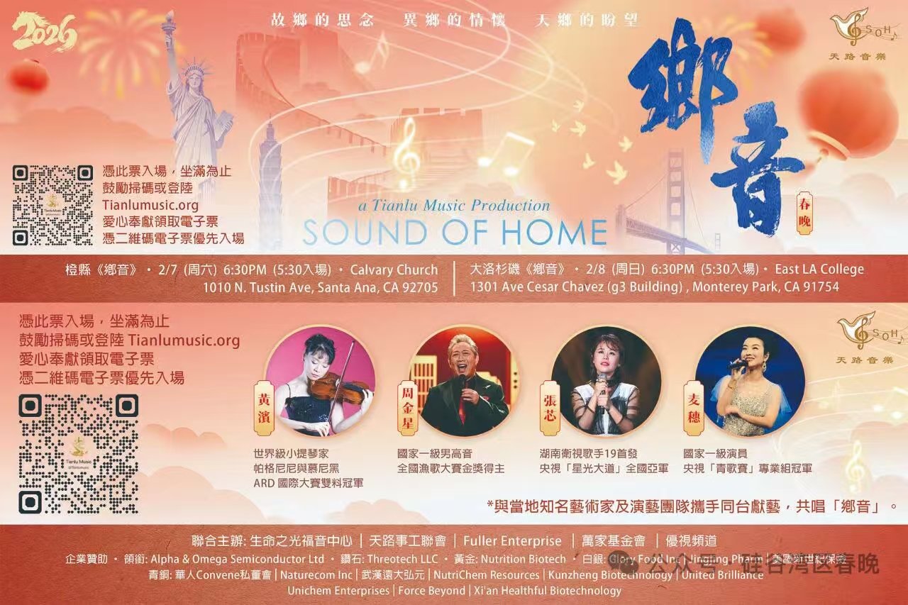 親愛的朋友們:新春快樂!願《鄉音》帶給您吉祥如意,福杯滿溢!衷心感謝您多年來對北美頂級佳節公益音樂會《鄉音》的支持與厚愛。十二年同行,《鄉音》陪伴我們走過歲月,鄉情卻始終如一、歷久彌新。今年,天路音樂將傾情推出全新音樂品牌——《鄉音》,為新的十二年揭開更加喜樂、更加盼望的篇章。在這個特別的時刻——