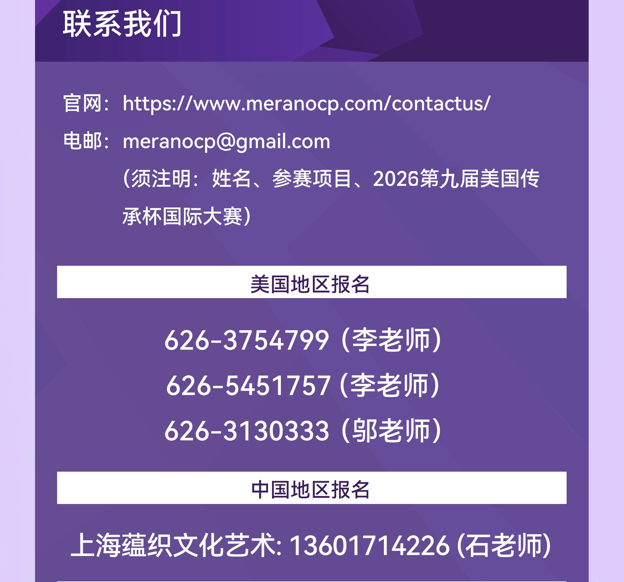 3. 任何形式/事由/付款等与组委会联系时必须清晰注明参赛者的中/英文姓名、参赛项目、2026第九届美国传承杯国际大赛。如未注明而造成的失误将由参赛者负责。