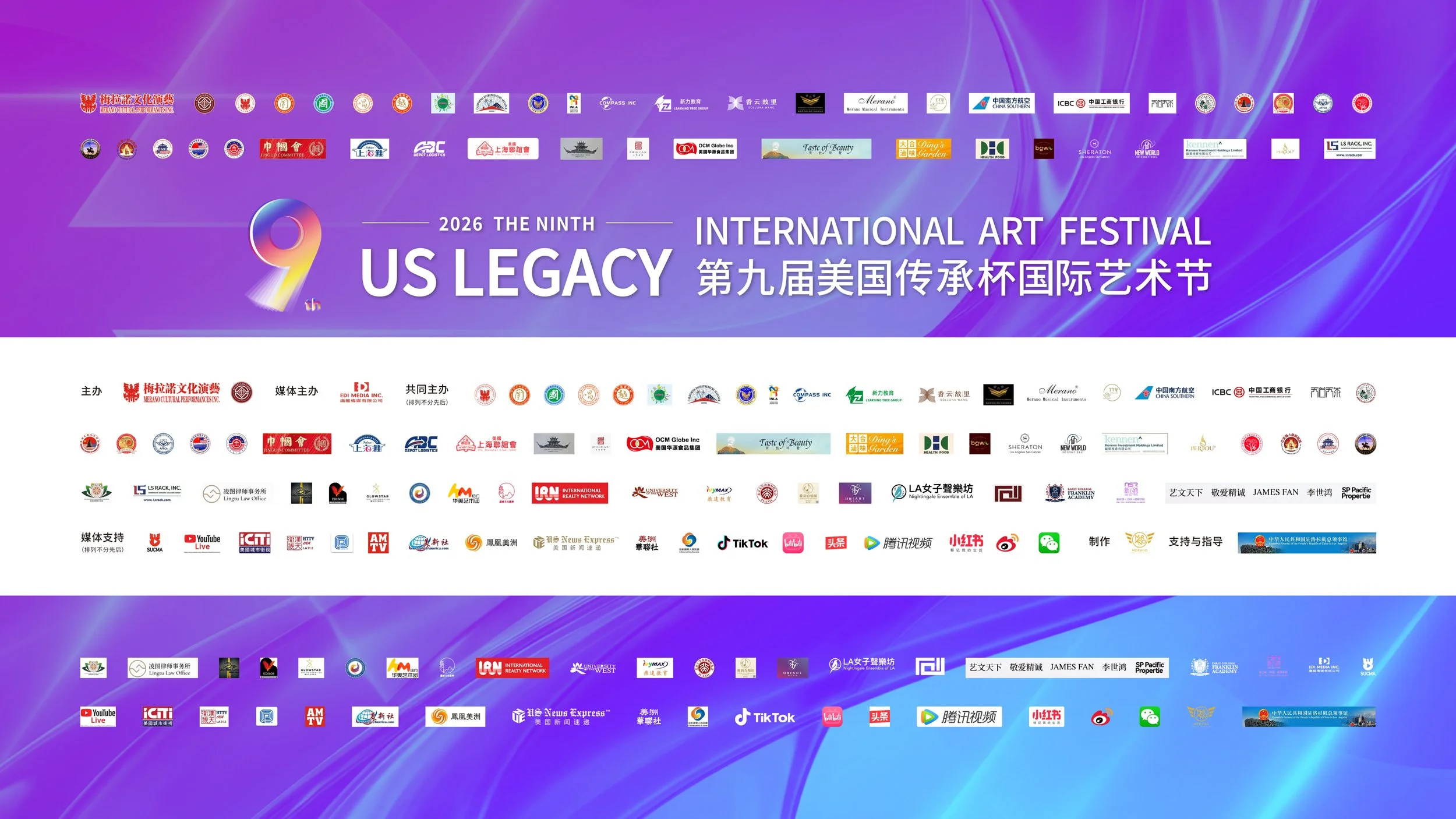 本届艺术节获中华人民共和国驻洛杉矶总领事馆悉心指导,并得到美国国会议员办公室、加州参众两院、洛杉矶郡政府、各地方政府及议会、百家海外华人华侨社团、文化机构与主流媒体鼎力支持,为活动顺利举办筑牢坚实保障。